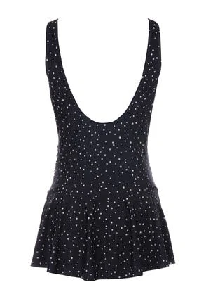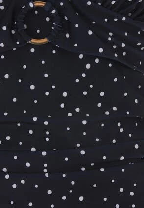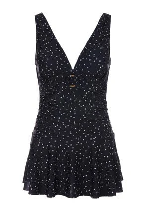 This V-neck Swimdress is perfect for providing extra coverage and a flattering shape. Featuring an all-over Black and Cream spot print design, a skirted brief, wide straps and stylish ring detail – perfect whilst swimming or lounging by the pool!