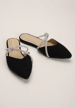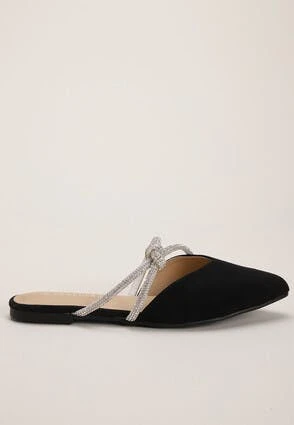 Add a bit of sparkle to your footwear collection with the Black backless ballet pumps. Featuring a flat sole with pointed toe and a sparkly diamante cross-over strap design.