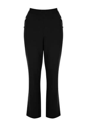 These stylish trousers will make a versatile and practical addition to your everyday wardrobe. In black with a straight leg, front pockets, and a comfortable elasticated back, plus gold button detailing on the sides, they’re a smart option suitable for work or any occasion.