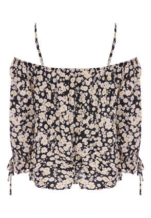 Update your summer staples with this black daisy printed cold shoulder top. Featuring an all over print with yellow and white daisies and an off the shoulder neckline, with small adjustable straps. The 3/4 length sleeves with tie details makes this piece perfect for summer days out!