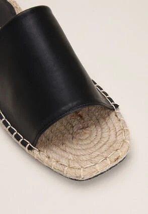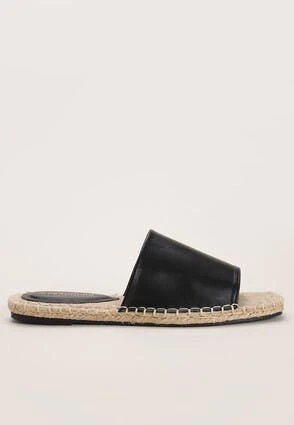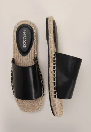 These lovely espadrille flat sandals will make a great addition to your new season wardrobe. They feature a comfortable sole, and a wide open toe slip-on style strap in a black faux leather.