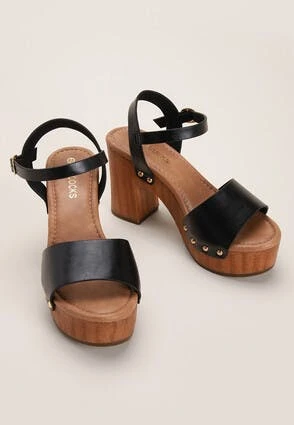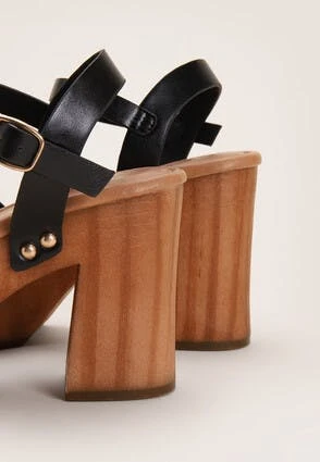 Update your footwear with these black and brown heeled clogs. Featuring a buckle fastening in a black faux leather, a matching upper strap, gold studs to complete the look and a 4 inch heel.