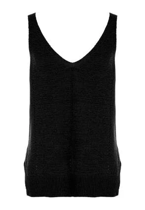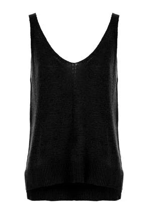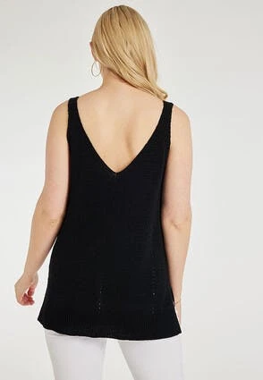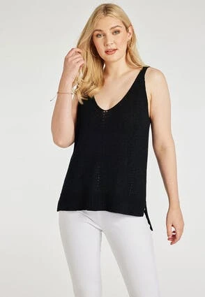 Keep it light this season with this gorgeous knitted sleeveless vest in black, with an open stitch detailing on the v-neckine and down the middle of the vest . Wear with a pair of your favourite denim jeans or shorts for an effortlessly stylish look.