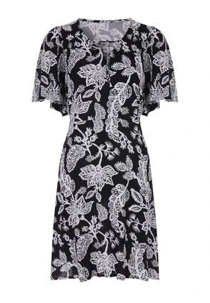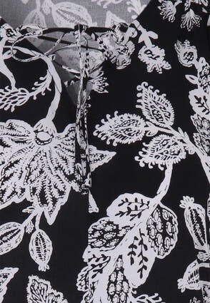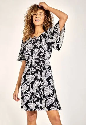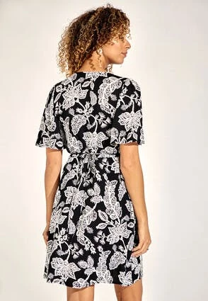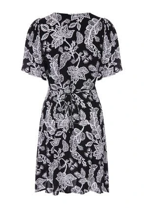This lovely knee length dress will make a stylish addition to your new season wardrobe. In black with a large white leaf print, a v-neckline and a criss-cross lace up design. This flattering dress, with tie belt can be dressed up or down with ease.