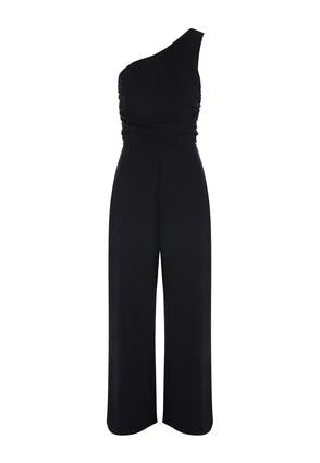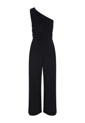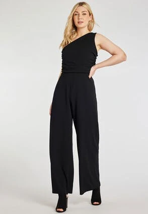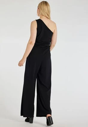 This one shouldered jumpsuit in classic black, with wide leg trousers is a versatile and stylish piece that can update your wardrobe. The one shoulder neckline is flattering and feminine, whilst the wide leg trousers are comfortable and stylish.