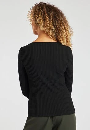 Update your wardrobe with this cosy top in a rib design. In black featuring a slashed boat neckline and long sleeves, this versatile top can be dressed up for days out, or worn with joggers or pj bottoms for relaxing at home.