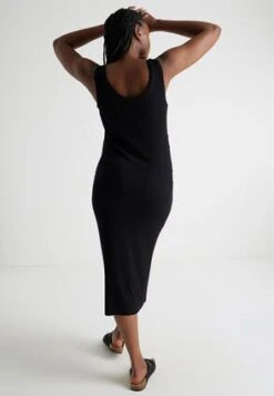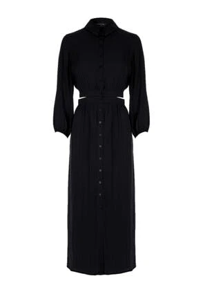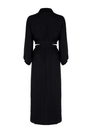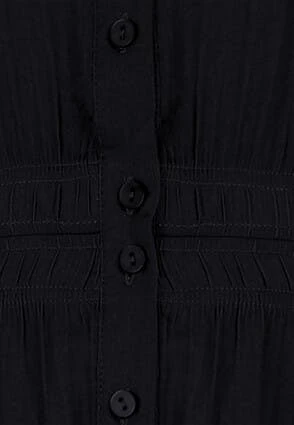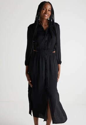 This light weight satin feel shirt dress will become your go to dress this season and is perfect to add to your weekend wardrobe. Featuring black satin feel fabric with long cuffed sleeves. The shirt style dress has a collar and buttons to the knee. The waist has two small cut out panels to each side with shirring details.