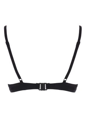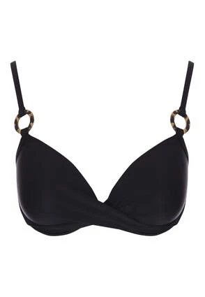 Get holiday ready with this gorgeous black bikini top. Features a snap back opening, and a plunging twist front with added tortoise shell detailing. Complete the look with the matching bikini bottoms.