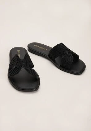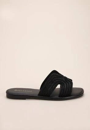 Featuring a black glitter woven strap and a flat heel! Ideal for summer or the beach. These black glitter sandals can be dressed up or down. Sitting on a flat heel with an raised embellished sequin strap, these versatile slide on style sandals will be perfect paired with floaty dresses or rolled up jeans – the combinations are endless!