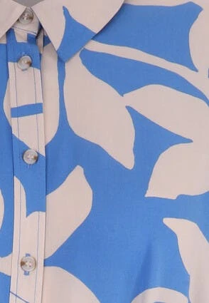 This gorgeous shirt dress in blue, with a large cream leaf print, will make the perfect addition to your new season wardrobe. It features a stylish shirt button neckline with a button down front, full length cuffed sleeves and a flattering tie waist belt. This dress also has a fuller skirt giving a fit an flare look.