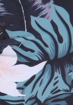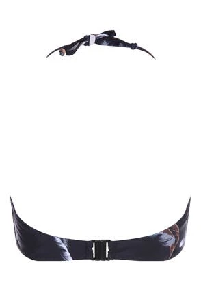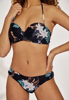 Add some style to your swimwear collection and get holiday ready with this black floral print bandeau bikini top. The tropical print is on a black base, with a blue. white and brown floral print. This stylish women’s bikini top features lightly padded cups, a ruched front, and a back strap with a snap clasp. Perfect for on the beach!