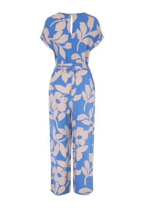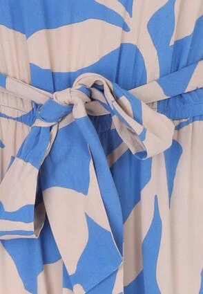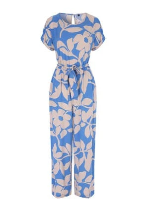 Turn heads with this stunning blue and cream large leaf jumpsuit, The full length trousers with pockets and the elasticated waist make sure of a flattering fit. They key hole back with zip fastening and a round neckline will make the perfect addition to your new season wardrobe.