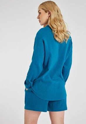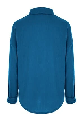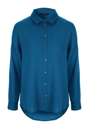 Add to your wardrobe essentials with this versatile womens shirt. In a plain blue crinkle cotton fabric, with long cuffed sleeves, and a button-up collar neckline. This versatile button up top can be worn in many different ways, from work wear, to a beach cover-up.