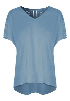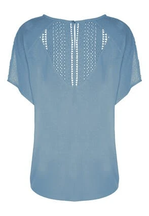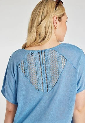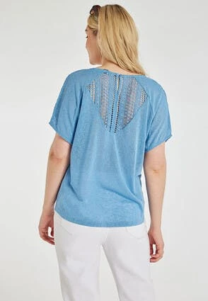 This lovely womens t-shirt in blue will make the perfect addition to your new season wardrobe. Features a short sleeves with a v-neckline, and a pretty lace broderie design on the back.