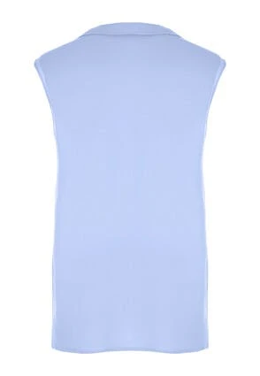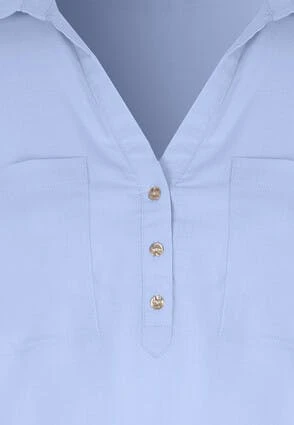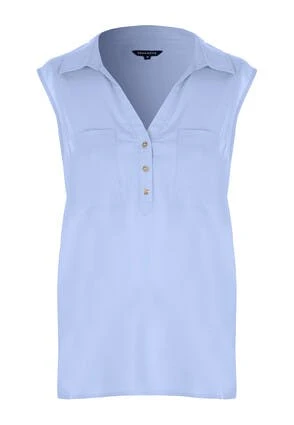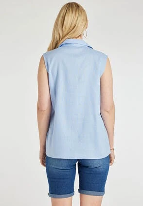 Update your new season wardrobe with this lovely womens shirt in soft blue. This stylish linen-blend shirt features a sleeveless design with a collar neckline, three buttons on the front and double pockets.