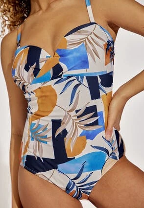 Get holiday ready with this tropical swimsuit, with a mixture of blues, browns and mustards, it’s an eye catching design. This one piece swimsuit also features removable straps and twisted design on the bust, what’s not to love?