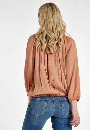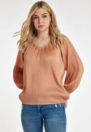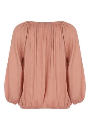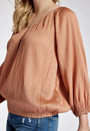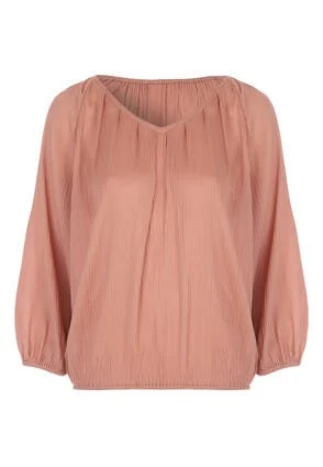 This lovely top is the perfect addition to your new season wardrobe. In a rose blush pink coloured lightweight crinkle textured fabric it features three quarter balloon cuffed sleeves, and a v-neckline.