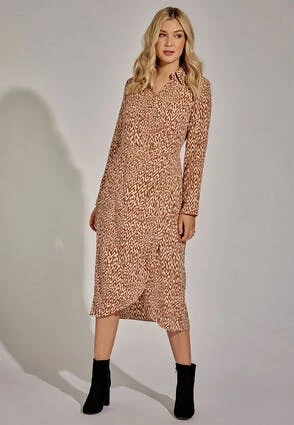 This gorgeous dress in a light brown animal print will make the perfect addition to your new season wardrobe. Features a light weight fabric and a v-neckline. The wrap style skirt has a split on the side.
