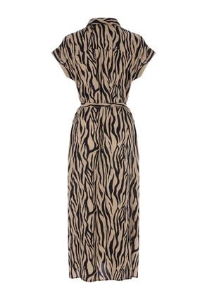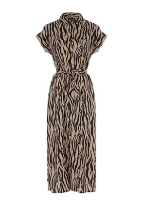 Add to your new season wardrobe with this gorgeous zebra print shirt dress. In light brown with an all over black zebra inspired print, it also features a collar with buttons to the hemline, and short capped sleeves. Pair with summer sandals or mini boots for an effortless outfit.
