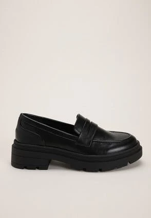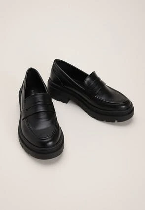 Update your footwear collection with these stylish slip-on loafers. In a black leather-look finish with a round toe and a chunky sole with a small block heel. These are a great shoe to add to almost any outfit for a smart casual look.