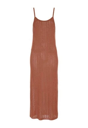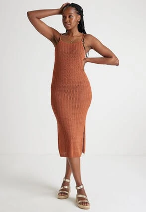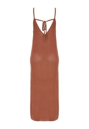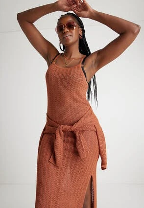 Update your new season wardrobe with this stylish knitted dress. In a gorgeous copper triangle pointelle knit with gold lurex thread throughout adding a gentle shimmer, it can be worn over your favorite swimwear pieces – perfect for the summer!