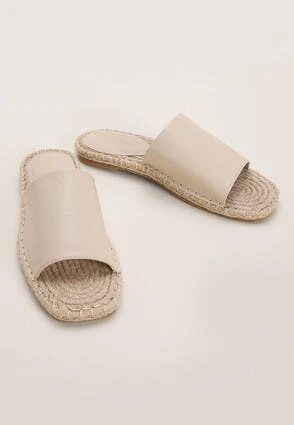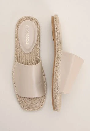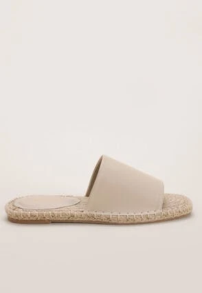 These lovely espadrille flat sandals will make a great addition to your new season wardrobe. They feature a comfortable sole, and a wide open toe slip-on style strap in a cream faux leather.