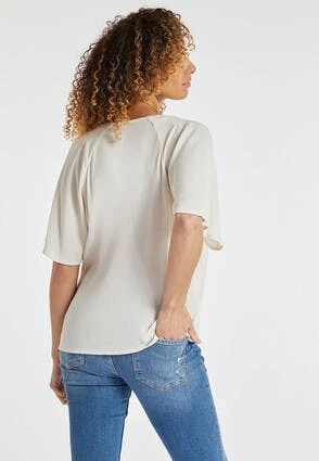 This gorgeous blouse in cream will make a versatile addition to your new season wardrobe. In a luxurious soft textured fabric, it features short angel sleeves, and a v-neckline.