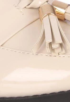 Update your footwear collection with these smart loafers. In a cream patent leather-look finish, featuring a gold tassel detail on the front, and a very small heel, they’re great to add to almost any outfit for a smart casual look.