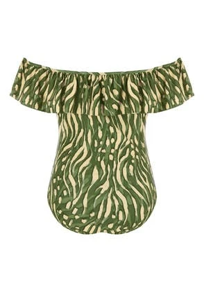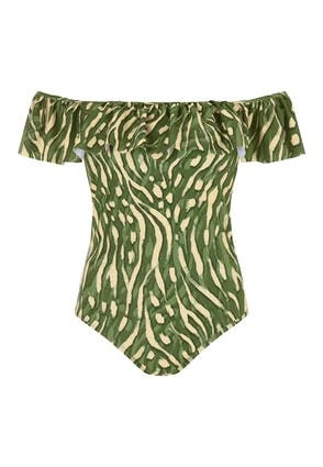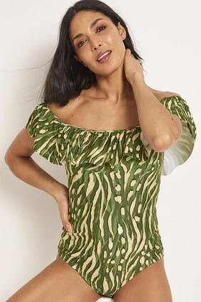 Add this stylish off the shoulder swimsuit to your swimwear collection this season. In green with a light cream abstract tropical design. Complete with bardot style frill neckline, this swimsuit is perfect for the beach or poolside this summer!
