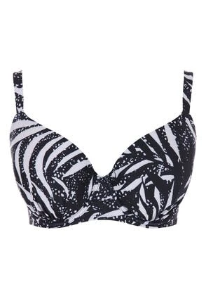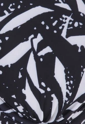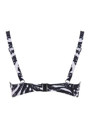 Get holiday ready with this gorgeous tropical print black and white bikini top. Available in sizes E-F. Featuring a snap back opening, and moulded padded cups, in a classic design. Complete the look with the matching bikini bottoms.
