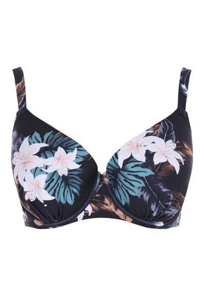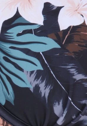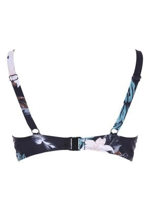 Get holiday ready with this gorgeous black floral and palm print bikini top. Features adjustable straps, a snap back opening, and a plunging front. Available in cup sizes E-F. Complete the look with the matching bikini bottoms.