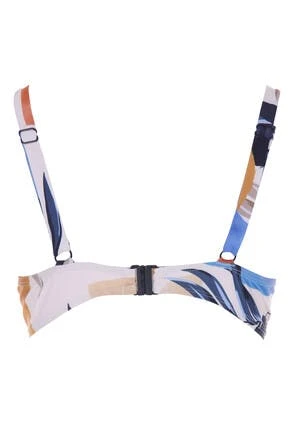 Get holiday ready with this gorgeous blue palm print bikini top. Features adjustable straps, a snap back opening, and a plunging front. Available in cup sizes E-F. Complete the look with the matching bikini bottoms.