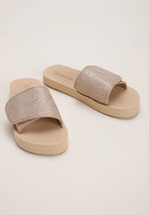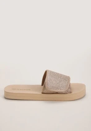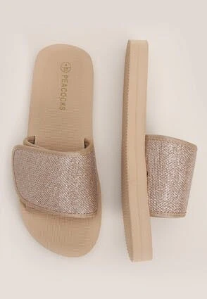 Nothing says ‘Summer’ like a pair of classic sliders. Sitting on a flat heel with a gold glitter velcro strap, these versatile sliders will be perfect paired with beachwear or rolled up jeans.