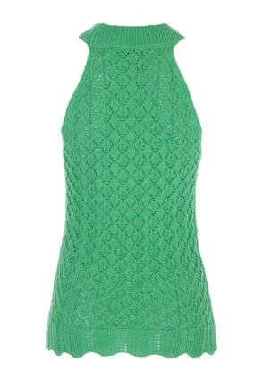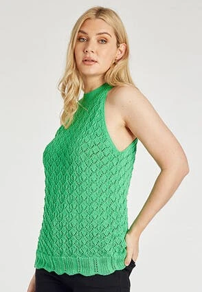 Add this gorgeous womens vest top to your new season wardrobe. In green this lovely vest top features a delicate crochet design on the body, a scalloped hemline and a ribbed neckline.