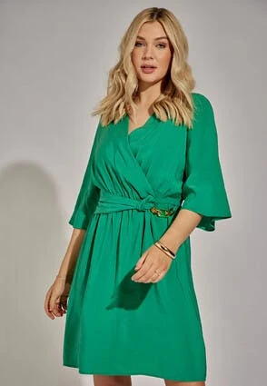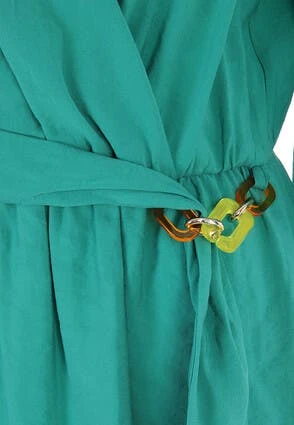 This gorgeous dress in green will make the perfect addition to your new season wardrobe. Features a wrap style v-neckline and loose fitting kimono style sleeves, plus a waist belt with a unique colourful chain detail.