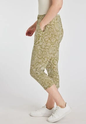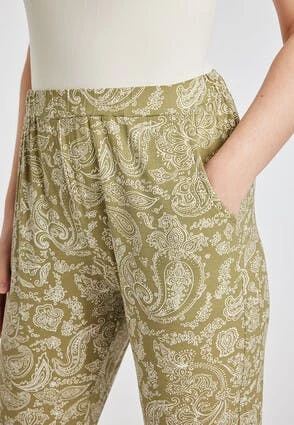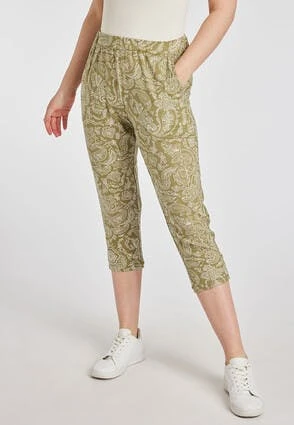 These stylish trousers will make a versatile and practical addition to your everyday wardrobe. In green with a white paisley pattern, a tapered cropped leg, pockets, and a comfortable elasticated waist, these trousers are a smart option suitable for work or any occasion