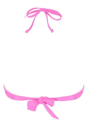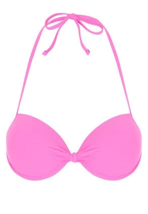 Get holiday ready with this hot pink bikini top. This brightly coloured women’s bikini top features padded cups, and a knotted centre detail. Perfect for on the beach!