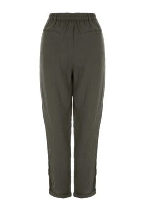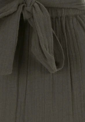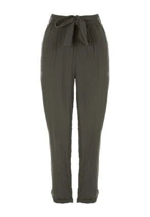 These gorgeous khaki trousers will make a versatile and practical addition to your everyday wardrobe. In a textured cotton gauze with a stylish tie waist detail, these trousers are perfect for a comfortable yet casual look.