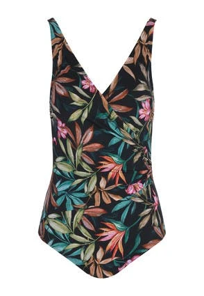 Add some style to your swimwear collection whist feeling great with this tropical print swimsuit. Bright florals on a dark khaki background makes the print on this swimsuit. This swimsuit has a slight drape at the top plus adjustable straps for added comfort.