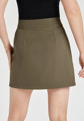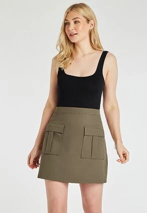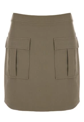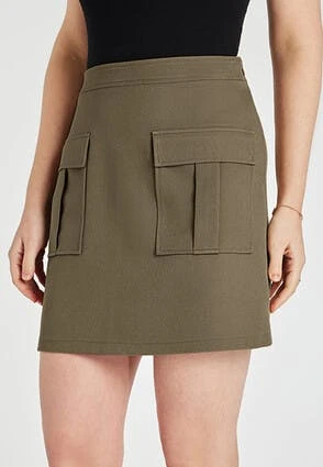 Refresh your wardribe with this on trend mini skirt. In a lovely khaki, this skirt features an elasticated waist and 2 front utility pockets with flaps. Wear with a loose fitting t-shirt and chunky boots for an effortlessly cool look