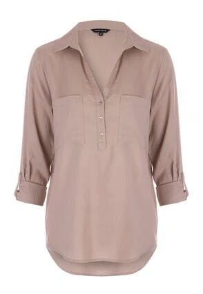 Update your new season wardrobe with this lovely womens shirt in light brown. This stylish linen-blend shirt features 3/4 length sleeves with gold button detail, a collar neckline and double pockets.
