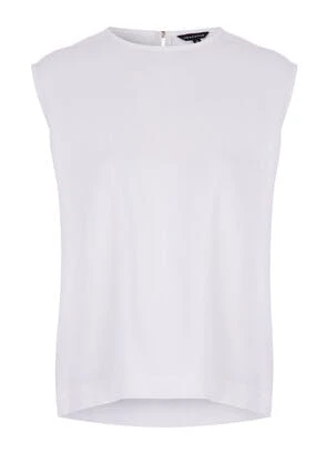 Add this versatile sleeveless top to your collection of basic essentials. In a soft cream fabric with a high round neckline and capped sleeves. Featuring a keyhole detail on the back with a gold button. It’s sure to make a great base for any outfit.