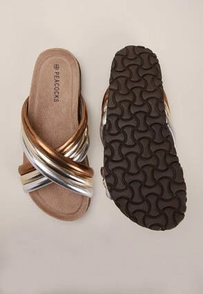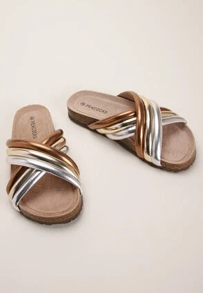 These lovely flat sandals will make a great addition to your new season wardrobe. They feature a comfortable chunky moulded sole, and a triple crossover in a shiny metallic bronze and silver.