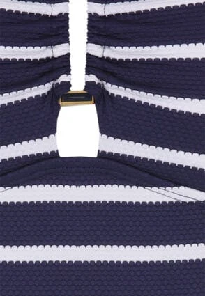 Add some style to your swimwear collection whist feeling great with this classic navy and white tummy control swimsuit. This flattering swimming costume features waist shaping and targeted tummy control, plus key hole cut out detailing on the front. The adjustable halter neck straps are removable.