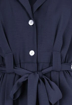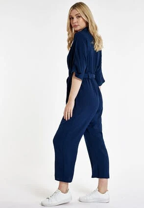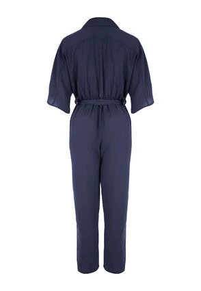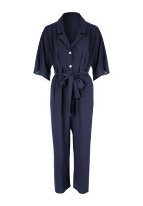 This lovely jumpsuit will make a stylish addition to your new season wardrobe. In denim blue with a lapel collar neckline with short flowing sleeves, and a flattering waist belt, it can be dressed up or down with ease.