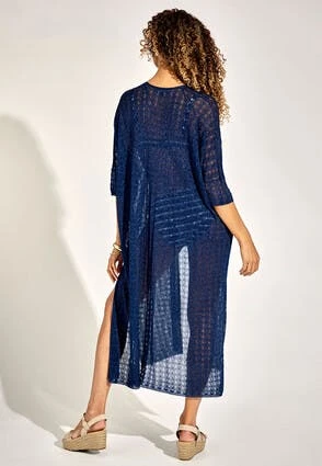 Wow them with this soft knit, navy longline cardigan. Ideal worn with a pair of jeans and trainers or mix it up and wear over a bikini on the beach! This versatile short sleeved cardigan can be a staple item for your wardrobe this spring/summer season.