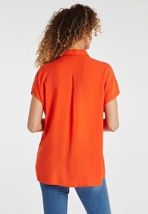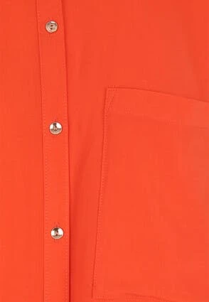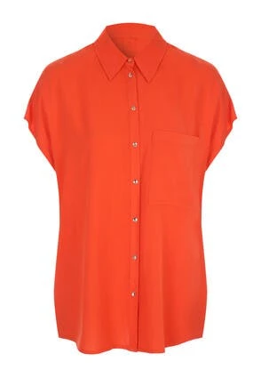 Add this shirt to your spring wardrobe and style with layers if required. This bright orange capped sleeve shirt with breast pocket is a fabulous versatile piece. With gold button all the way down the centre, those little details add an extra flair.