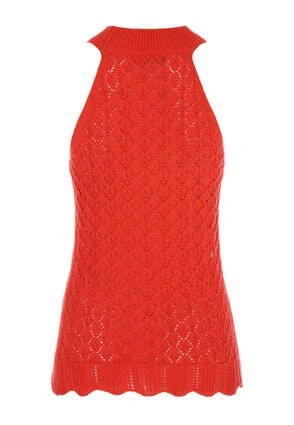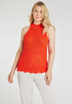 Add this gorgeous womens vest top to your new season wardrobe. In orange this lovely vest top features a delicate crochet design on the body, a scalloped hemline and a ribbed neckline.