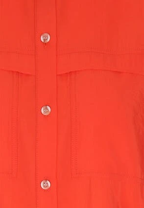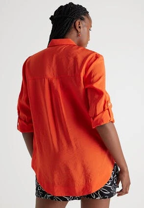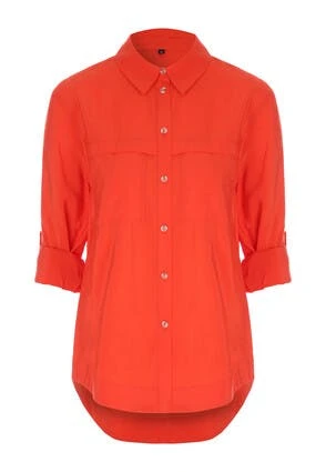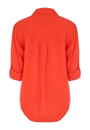 Update your new season wardrobe with this lovely womens shirt in bright orange. This stylish cupro blend shirt is ideal for summer clothing, cupro blend is pleasant to touch and is quick drying, as well as being comfortable and cool. It also features 3/4 length sleeves with gold button detail, a collar neckline and double pockets.