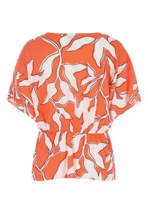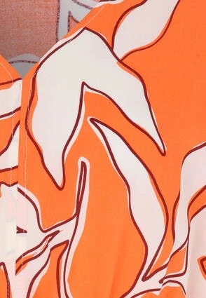 Update your collection of everyday tops with this fun blouse. In a bright orange fabric with a bold cream leaf print design, short angel sleeves, a v-neckline and tie waist detailing, it can be worn with some summer shorts or a pair of your favourite jeans.